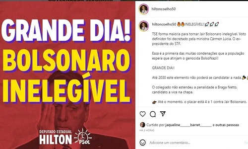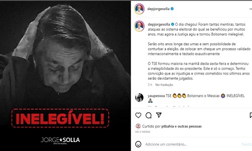 Enquanto políticos bolsonaristas lamentam a decisão do TSE, os petistas baianos comemoram o julgamento desta sexta (30), que condenou Bolsonaro por abuso de poder político. Nas redes sociais, o governador Jerônimo Rodrigues (PT) falou sobre o assunto fazendo alusão ao 2 de Julho.