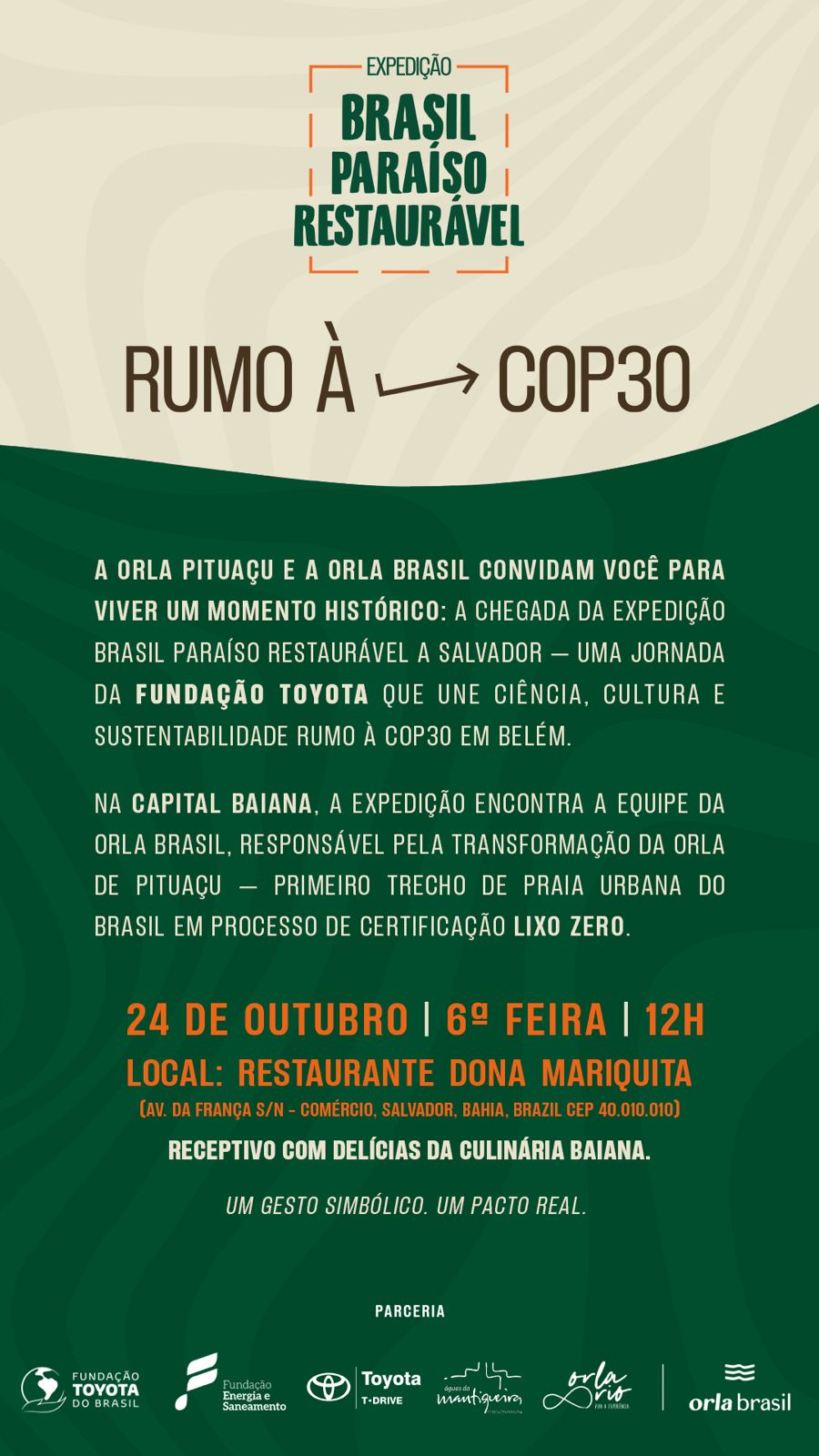 No dia 23/10, a expedição encontra a equipe da Orla Brasil, responsável pela transformação da orla de Pituaçu — primeiro trecho de praia urbana do Brasil em processo de certificação Lixo Zero. No local, os pesquisadores poderão observar alguns dos desafios da região, como a alta concentração de salitre (forma corrosiva do cloreto e sulfato trazidos pela brisa do mar), que acaba dificultando o crescimento de muitas da vegetação. Outro grande desafio é debater com os pesquisadores o que poderá ser feito sobre a BaciaHidrográfica do Rio das Pedras, considerada a quarta maior bacia hidrográfica em Salvador, e Rio Jaguaribe que sofrem com a poluição local, impactando a orla onde desagua.