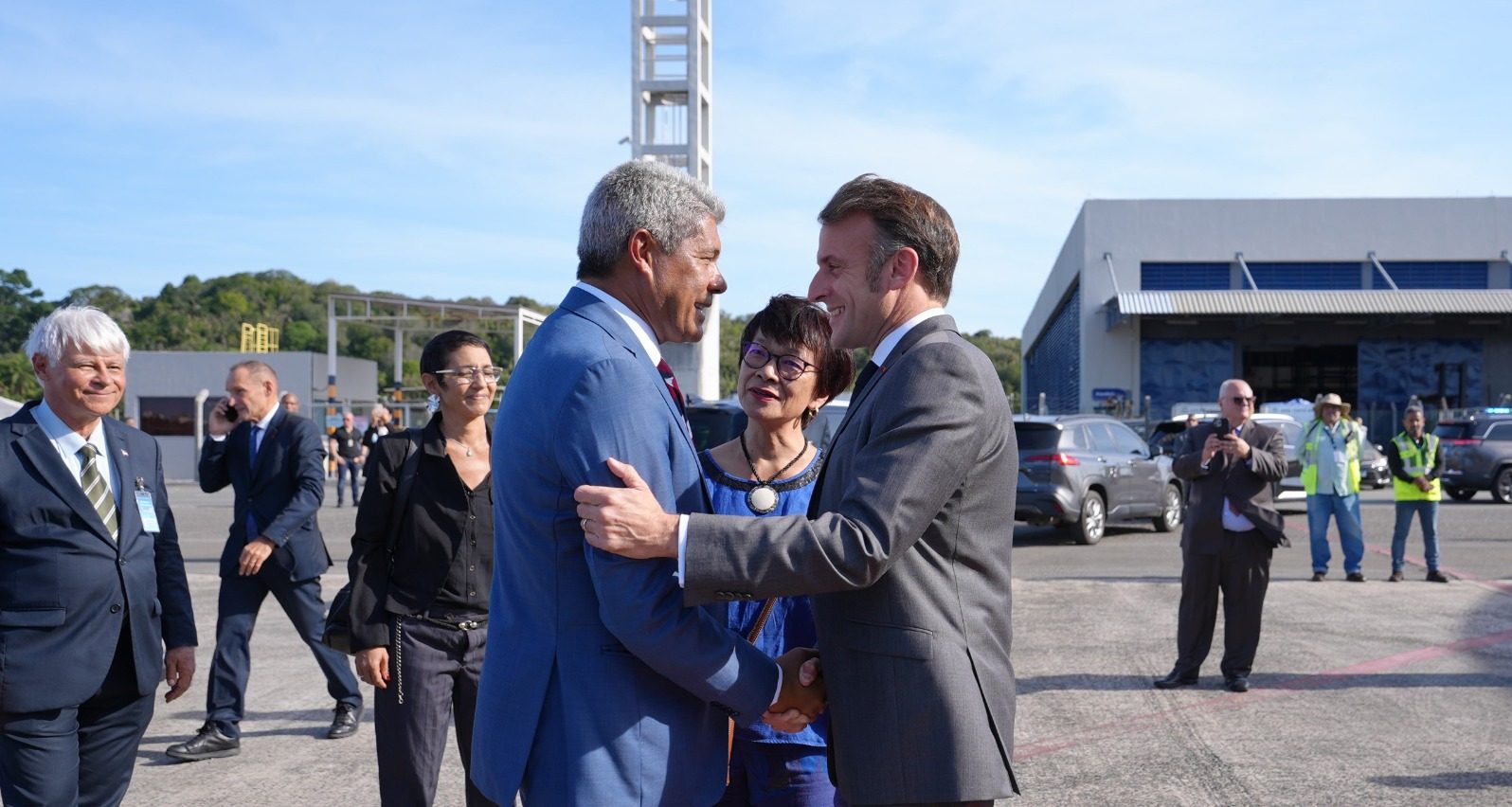 O governador Jerônimo Rodrigues recepcionou o presidente da França, Emmanuel Macron, que desembarcou no Aeroporto de Salvador na tarde desta quarta-feira (5), para o início de uma agenda dedicada à cultura e à cooperação internacional. Ao lado da ministra da Cultura, Margareth Menezes, o governador participa de compromissos que incluem visita ao Pelourinho e a abertura oficial do Festival Nosso Futuro Brasil-França: Diálogos com a África, no Museu de Arte Moderna da Bahia (MAM).