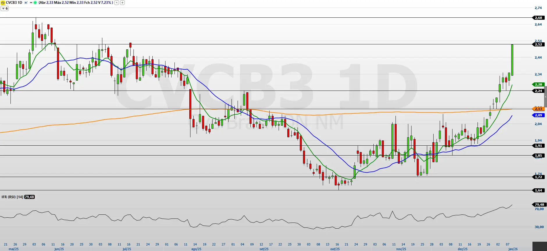 A CVC (CVCB3) volta a figurar entre as ações mais “esticadas” do Ibovespa à luz do Índice de Força Relativa (IFR). A leitura mais recente posiciona o indicador em 79,48 pontos, nível clássico de sobrecompra, indicando que, após uma sequência robusta de altas, o papel pode se aproximar de um ajuste técnico. No acumulado de 2025, a companhia registrou alta de 56,52, enquanto, nos últimos 12 meses, sobe 57,50%.