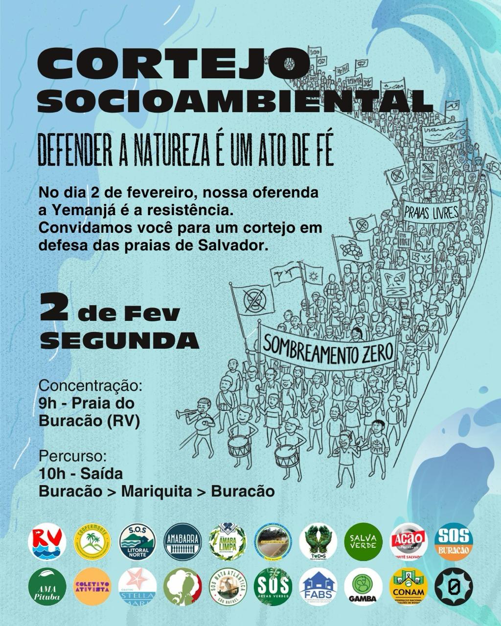 Antes de sair, os participantes realizarão plantio de árvores para reforçar que a única sombra tolerada nas praias de Salvador deve ser a da vegetação de restinga. O cortejo é aberto ao público, vai contar com fanfarra e convida coletivos socioambientais, movimentos sociais e organizações da sociedade civil a participar.