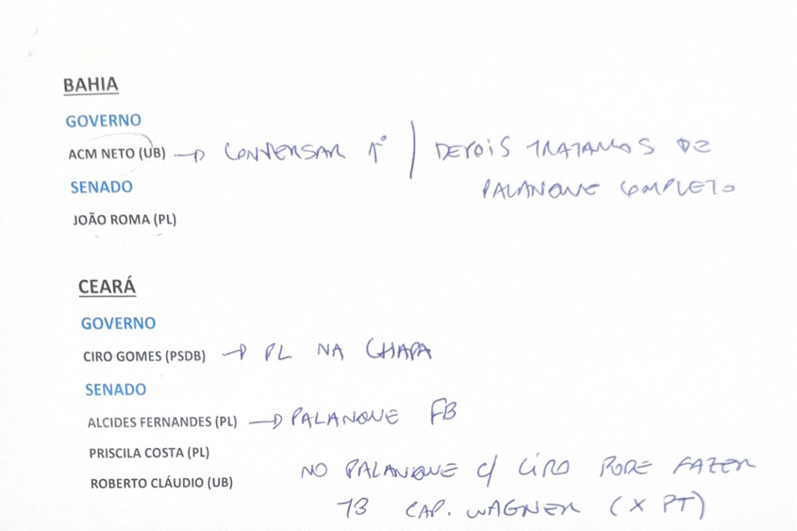 Nos documentos, Flávio aponta como certa a candidatura de João Roma (PL) ao Senado na Bahia. Sobre ACM Neto, há a observação de que seria necessário “conversar primeiro” antes de definir a composição completa do palanque no estado.