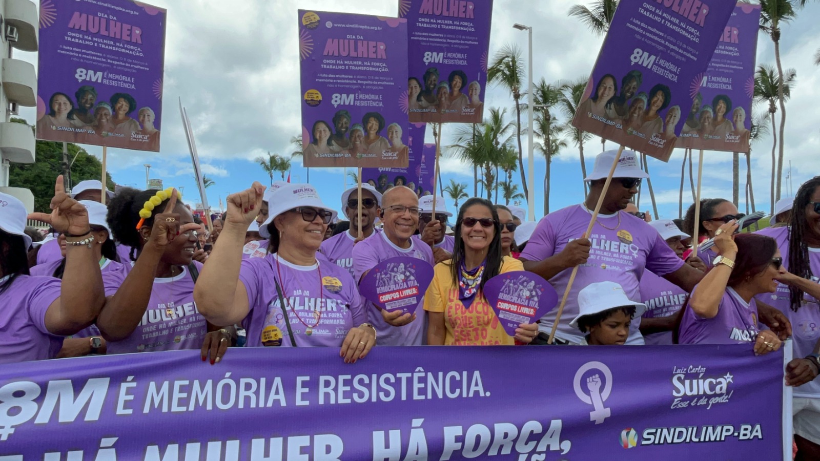 Representantes do Sindicato dos Trabalhadores e Trabalhadoras da Limpeza Urbana e Terceirizada da Bahia (Sindilimp) e da Associação dos Trabalhadores em Limpeza do Estado da Bahia (ASLIMP) também participaram da Marcha das Mulheres. As entidades reforçaram, durante o ato, a importância de fortalecer a luta contra qualquer forma de violência e desrespeito às mulheres, além de defender direitos e valorização das categorias que representam.