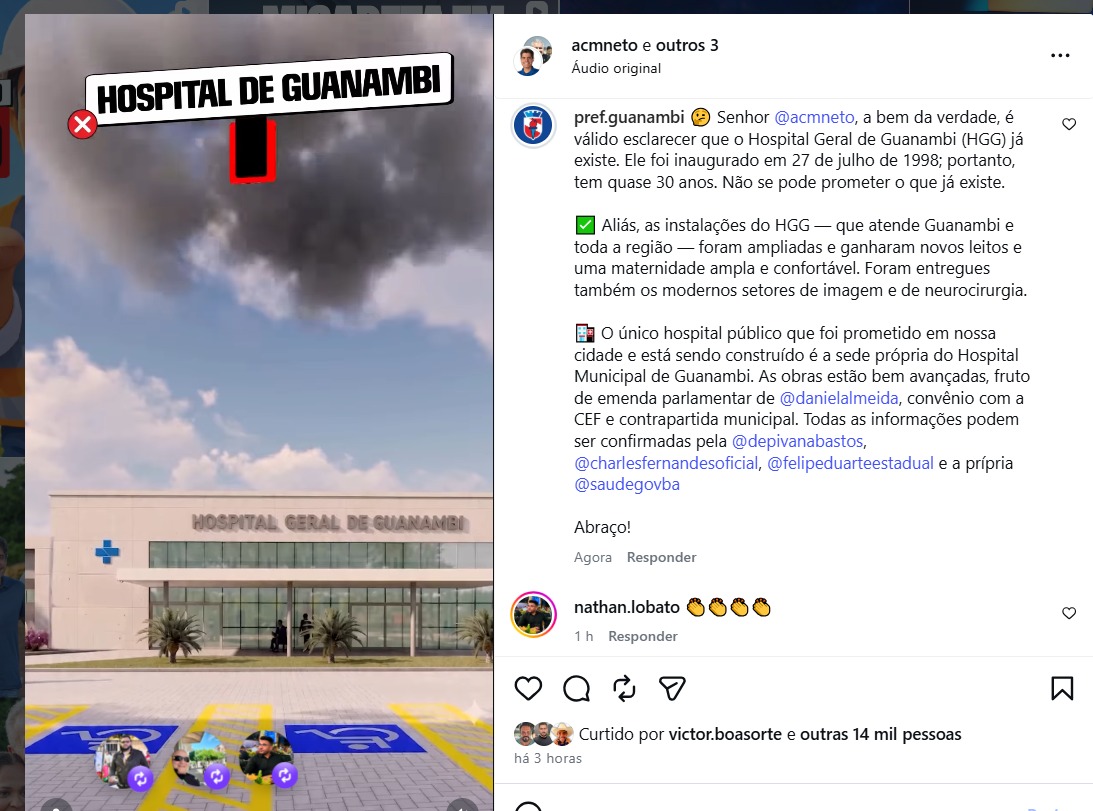 “Senhor @acmneto, a bem da verdade, é válido esclarecer que o Hospital Geral de Guanambi (HGG) já existe. Ele foi inaugurado em 27 de julho de 1998; portanto, tem quase 30 anos. Não se pode prometer o que já existe”, informa a postagem.